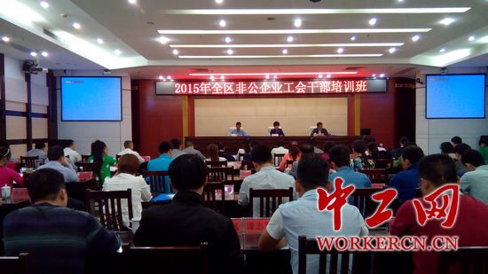 中工网讯 4月13日至17日,广西壮族自治区2015年第一期“全区非公企业工会干部培训班”在南宁广西区总工会干部学校举办。来自广西各市、县、城区的非公企业及非公企业工会联合会的工会主席和业务骨干共140多人参加培训。广西区总副主席陈湘文、广西区总组织部部长徐辉长、广西区总工会干部学校党总支书记、校长覃其宏等出席开班仪式,陈湘文做开班动员讲话。